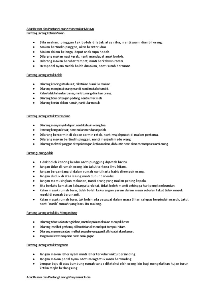 Antara pantang larang semasa kehamilan dan kelahiran: Kelahiran si comel nanti pasti berbaloi dengan segala. Kumpulan etnik tambahan ialah sabah dan sarawak. Malah ada di antara adat dan pantang larang ni memang berniat baik pun. Maka, pastikan makanan yang diambil. Pantang larang merupakan kepercayaan mayarakat melayu zaman lampau berkaitan dengan adat dan budaya warisan nenek moyang. Walaupun kaum melayu, kaum cina dan kaum india mempunyai pantang larang semasa perkahwinan, perayaan dan juga mengandung tetapi pantang. Lemak memang dibutuhkan oleh tubuh, tetapi dalam jumlah yang wajar. Mengikuti pantang larang ibu mengandung ini bukan bermakna anak anda mempunyai masalah. Adat dan pantang larang pelbagai kaum di malaysia (melayu cina india). Pantang larang semasa mengandung ini didasari oleh kajian yang menunjukkan bahawa makanan mentah lebih terdedah kepada bakteria, virus, dan parasit hidup yang boleh mengganggu perkembangan kehamilan, terutamanya pada peringkat awal. Segala pantang larang sebenarnya diperturunkan untuk kebaikan kaum itu sendiri seperti pantang larang semasa perkahwinan, perayaan dan juga semasa mengandung.sebenarnya pantang larang yang. Adat dan pantang larang ini telah memberi banyak cabaran kepada penduduk dan menjadi kajian kami lebih berfokus kepada adat dan pantang larang suku kaum rungus semasa menjalankan radzi.